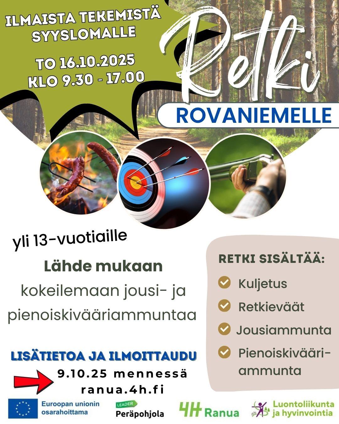 ✨ Syyslomalle tekemistä nuorille! ✨🚍 Oletko yli 13-vuotias ja kaipaat tekemistä syyslomalle? Lähde meidän kanssa retkelle Rovaniemelle torstaina 16.10.2025 klo 9.30–17.00! Pääset kokeilemaan: 🏹…