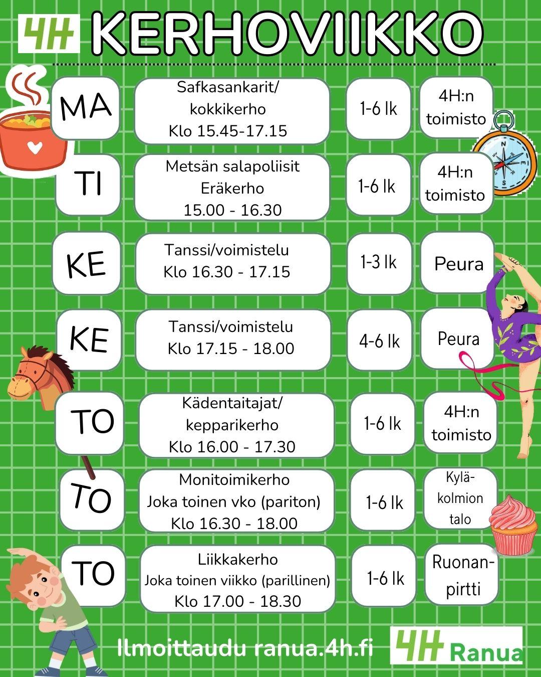 Ranuan 4H-yhdistys järjestää lapsille ja nuorille kerhotoimintaa, leirejä, kursseja ja koko perheen tapahtumia. Lisäksi nuorille on tarjolla erilaisia työllistymismahdollisuuksia kausitöiden ja 4H-yrittäjyyden kautta.