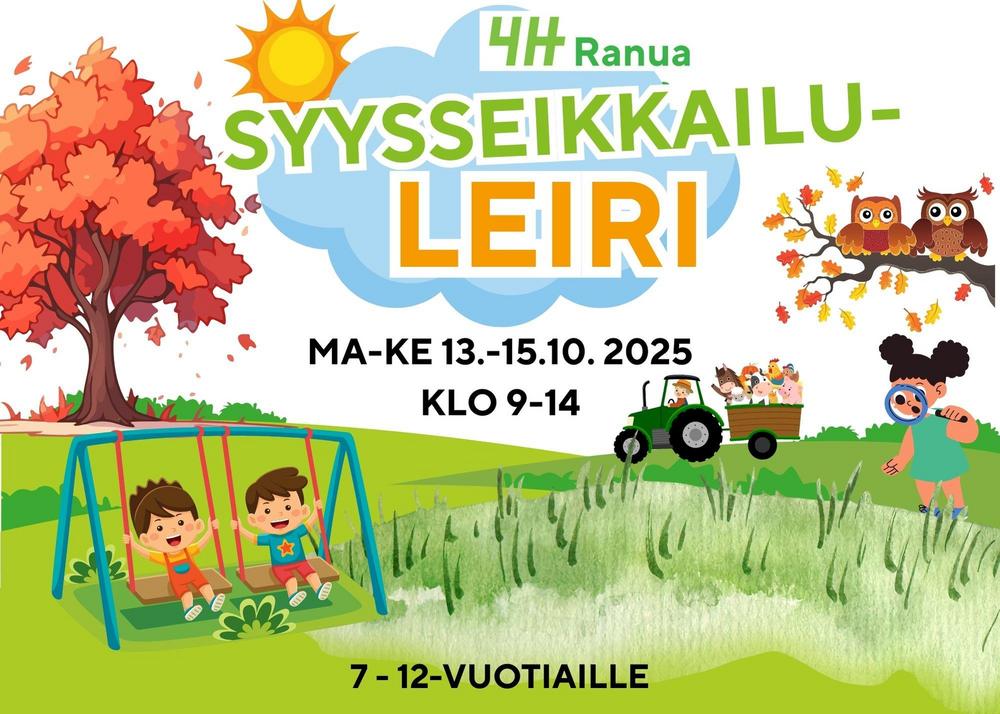 Syysseikkailuleiri 13.-15.10.2025 - Leiri on suunnattu 7-12-vuotiaille - Toteutus päiväleirinä klo 9-14, kokoontuminen Ranuan 4H-toimistolla (Kuusitie 1) - Leirillä ulkoillaan, pelataan, askarrellaan…