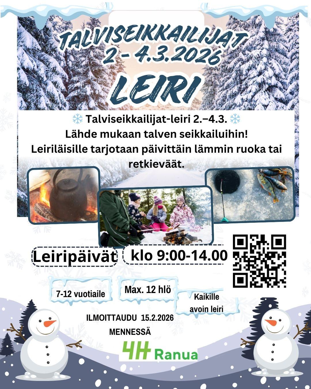 ❄️ Talviseikkailijat-leiri 2.–4.3. ❄️ Lähde mukaan talven seikkailuihin! Talviseikkailijat-leiri järjestetään Ranualla, ja tukikohtana toimii Ranuan 4H, josta tehdään pieniä tutustumiskäyntejä…