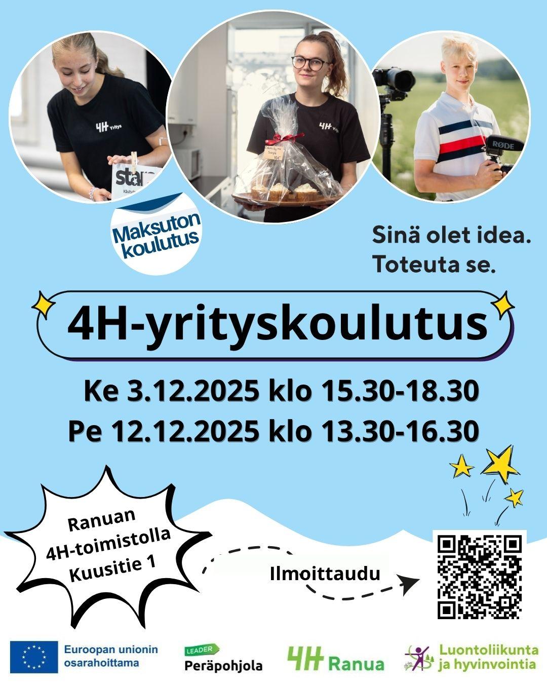 Koulutuspäivät Keskiviikko 3.12.2025 klo 15.30-18.30 (osa 1) Perjantai 12.12.2025 klo 13.30-16.30 (osa 2) Paikka: Ranuan 4H-yhdistyksen toimisto, Kuusitie 1 Ilmoittaudu koulutukseen viimeistään…