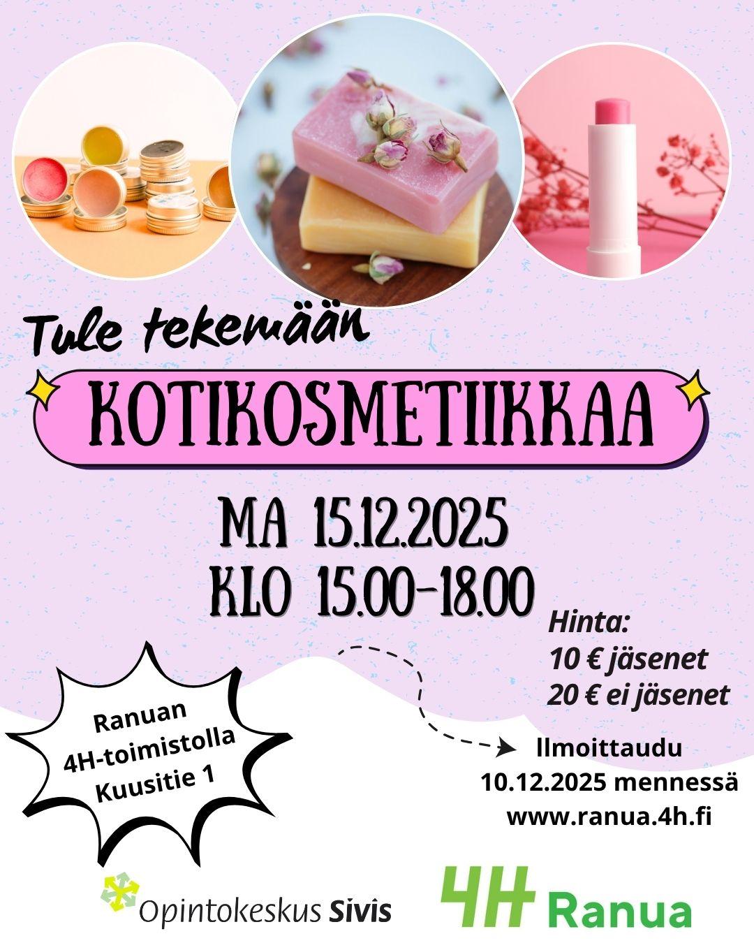 🌸 Tule tekemään omaa kotikosmetiikkaa! 🌸 Haluaisitko oppia valmistamaan itse huulirasvaa, saippuaa tai muita luonnonkosmetiikan tuotteita? Tervetuloa mukaan kotikosmetiikkatyöpajaan Maanantaina…