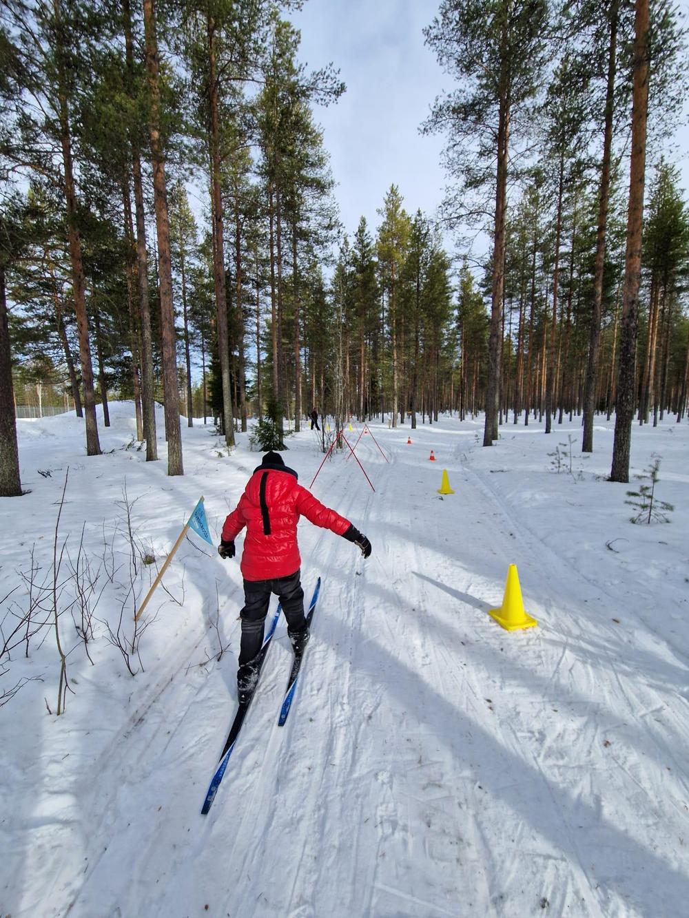 - Yhden jalan hiihto: Nosta toinen jalka hetkeksi ilmassa, pitäen tasapaino vain toisella suksea tukien. Vaihda jalkaa.